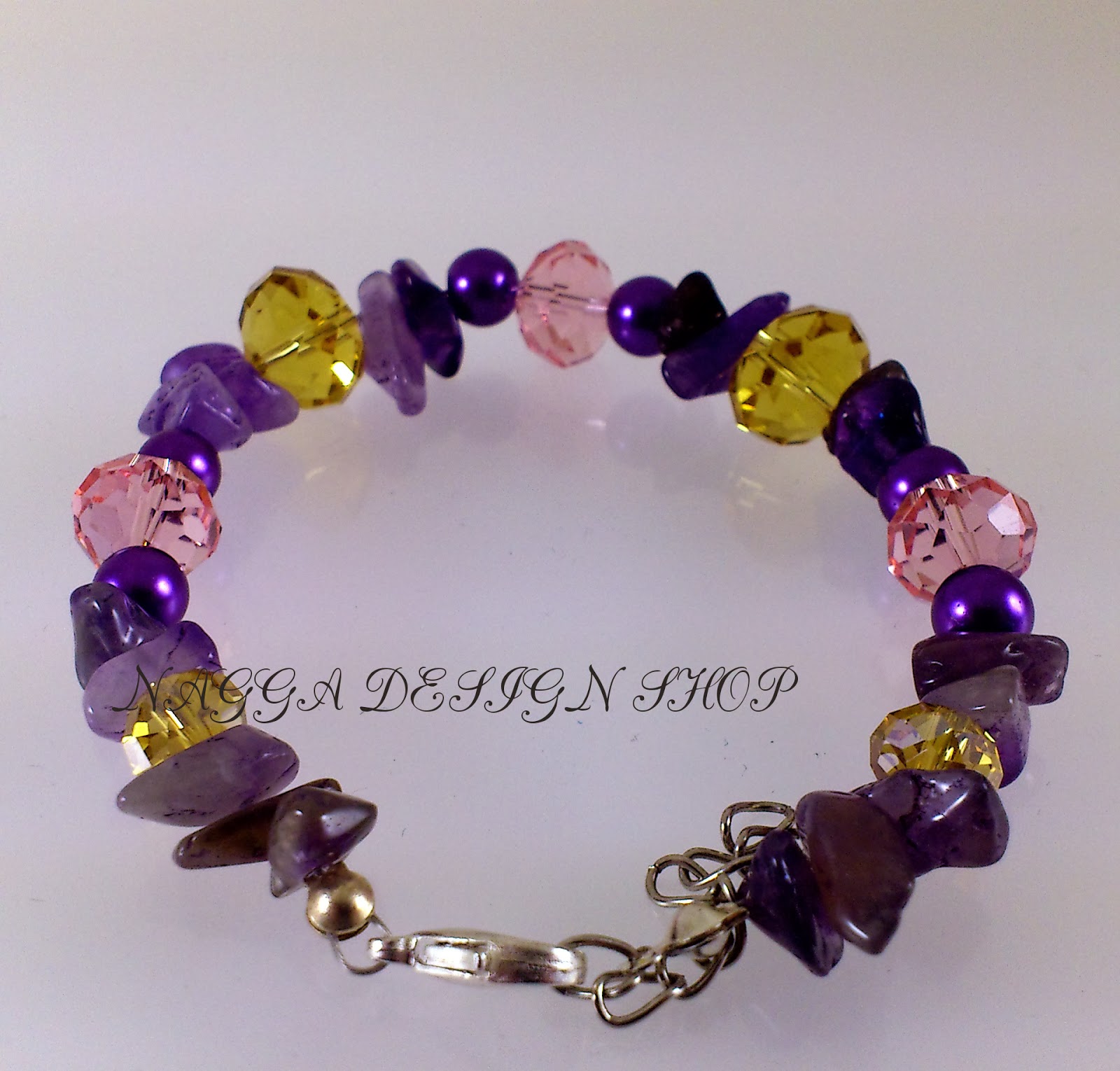This bracelet is an ideal accessory for shirts,blouses,dresses,knitwear.It is made with combination of amethyst chips,purple glass pearls,soft pink and yellow faceted glass beads and metal findings.
